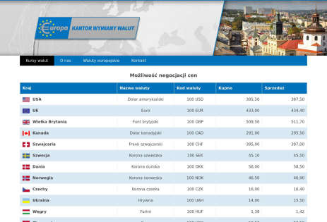 Kantor wymiany walut Europa jest jednym z najdłużej działających kantorów w Lublinie. Swoją sziałalność prowadzimy nieprzerwanie od 1989r. Wieloletnie istnienie firmy potwierdza jej wiarygodność, umiejętność dostosowania się do potrzeb rynku oraz zaufanie klientów. Obsługujemy klientów indywidualnych i podmioty gospodarcze. Wystawiamy dokumenty transakcji kupna, sprzedaży walut, imienne i na firmę. Mieścimy się w centrum Lublina w budynku Hotelu Europa przy ulicy Krakowskie Przedmieście 29 (przy deptaku). W pobliżu zlokalizowanych jest wiele instytucji finansowych i banków. Zapewniamy miłą i szybką obsługę.