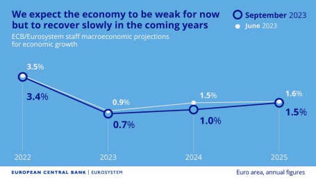 Najnowsze dane z Europejskiego Banku Centralnego (EBC) oraz Eurostatu, agencji statystycznej UE, pokazują, że inflacja w strefie euro znacznie wzrosła w porównaniu do poprzednich lat, ale zaczyna się obniżać. W sierpniu 2023 roku wskaźnik inflacji w strefie euro wyniósł 5,3 proc., co jest znaczącym wzrostem w porównaniu do poziomu z ubiegłego roku. Na przyszły rok ekonomiści zakładają 3% a w 2025r 2%. To oznacza, że już za dwa lata inflacja wraca na poziomy zbliżone do celu EBC, który wynosi nieco poniżej 2%.