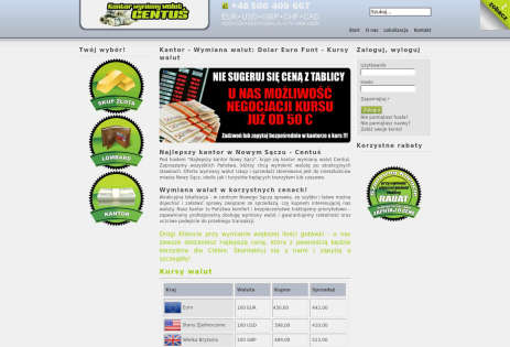 Kantor Centuś działa stosunkowo niedługo, lecz oferta, która jest naszym przedmiotem działania przebija konkurencję i jest prawdopodobnie najlepszą w Nowym Sączu i regionie. Rzetelność, profesjonalizm i uczciwość podczas przebiegu transakcji oraz korzyści związane z preferencyjnymi stawkami są naszymi priorytetami, jednocześnie celem i misją. Wszystko to w odniesieniu do Klienta i jego zadowolenia.