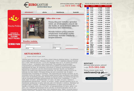 StrefaWalut.pl zgromadziła ponad 2 tysiące kantorów stacjonarnych, a każdy z nich został opisany w wyczerpujący sposób. Kontaktując się z właścicielami i pracownikami poszczególnych placówek udało nam się zebrać szczegółowe informacje na temat ich kantorów. Wchodząc w poszczególne wizytówki dowiecie się o dokładnym adresie fizycznym konkretnego punktu wymiany, numerze telefonu, godzinach otwarcia czy adresie e-mail i stronie WWW. Ponadto, StrefaWalut.pl prezentuje też dane na temat ewentualnej wymiany bilonu w kantorze stacjonarnym, negocjacji kursów czy telefonicznej rezerwacji aktualnych stawek.