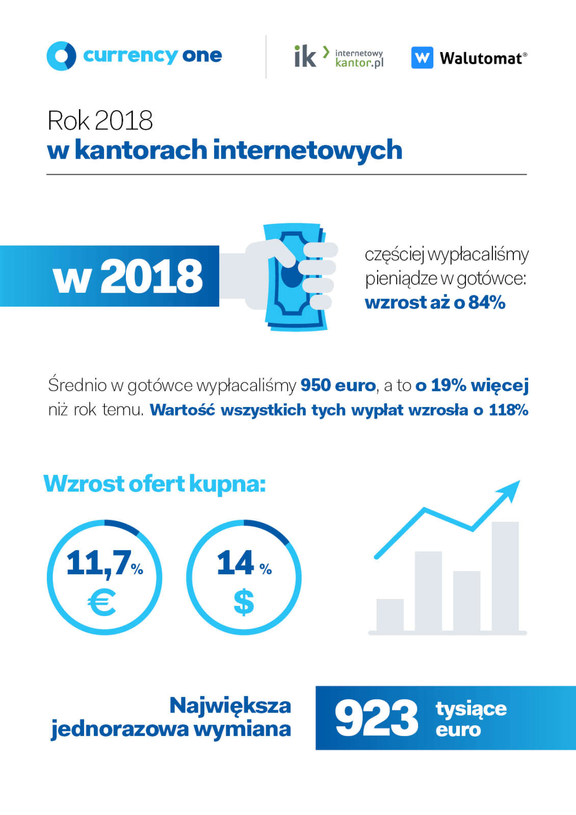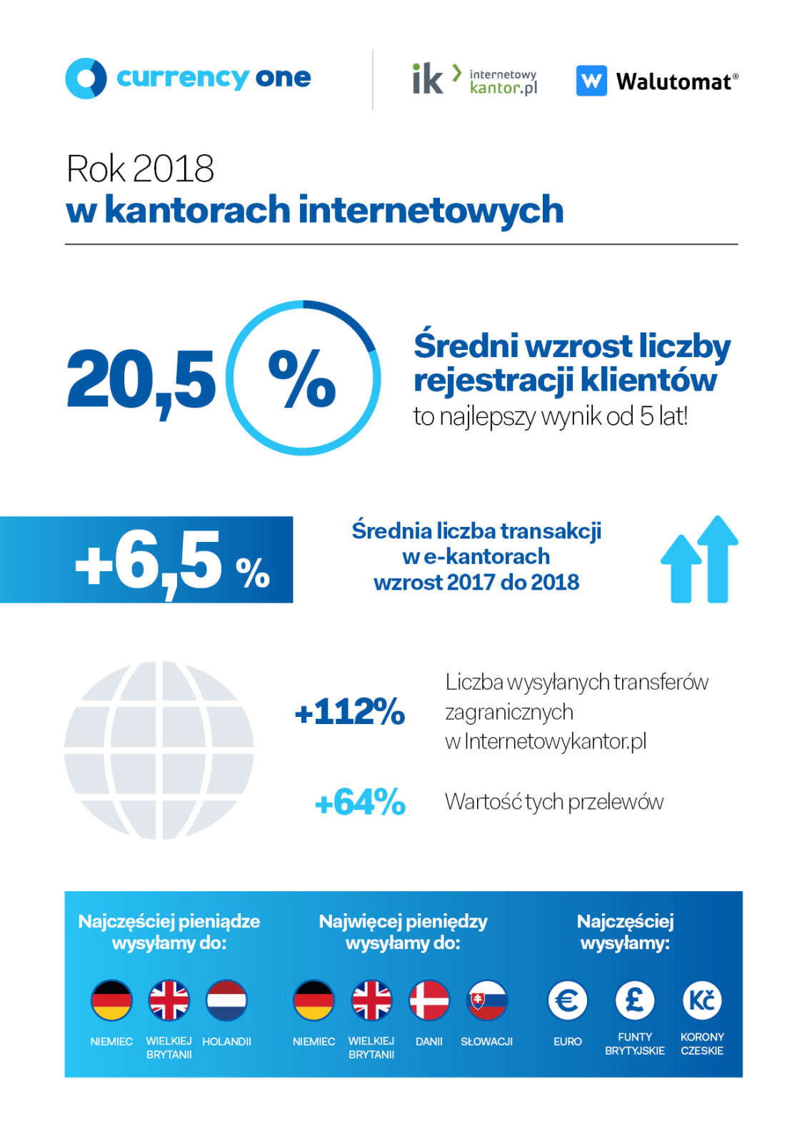 Większość głównych wydarzeń 2018 wciąż trwa i niewykluczone, że robiąc zestawienie na 2019 rok spora część tematów powtórzy się. Mają one bowiem dalszy wpływ na rynki finansowe, w tym na branżę kantorów online, które, mimo wahań na światowych rynkach, stale rosną w siłę. Ostatnie 12 miesięcy to dalszy, dynamiczny rozwój serwisów oferujących wymianę walut przez Internet. Jak pokazują dane opublikowane przez Currency One, operatora serwisów Internetowykantor.pl i Walutomat.pl, Polacy coraz chętniej decydują się przenieść swoje potrzeby walutowe do Internetu. Według statystyk aż