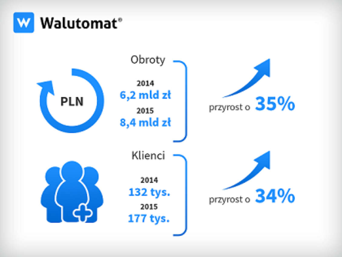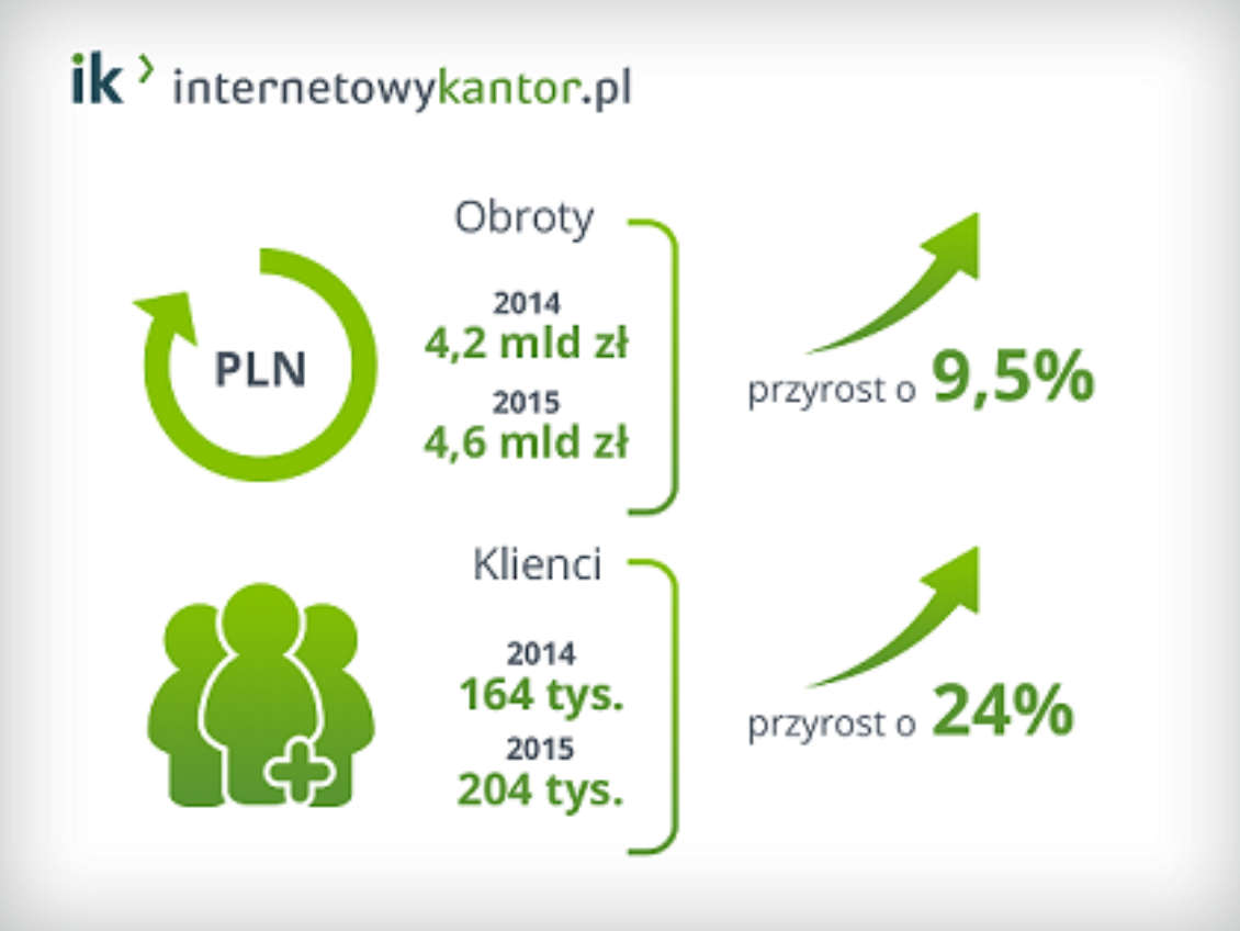 Przykładowo w 2015 r. w serwisie Internetowykantor.pl liczba klientów wzrosła o 24 proc. i osiągnęła ponad 200 tys. W Walutomacie w 2015 r. przybyło aż 34 proc. wymieniających (obecnie 177 tys.). Roczne obroty obu serwisów były rekordowe i wyniosły 13 mld zł. Tym samym wzrosły o 25 proc. w stosunku do 2014 r.