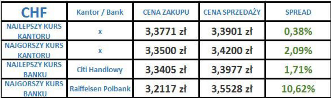 W pierwszej tabeli zestawiono najlepsze ceny zakupu/sprzedaży franka szwajcarskiego w: kantorze internetowym o najniższym spreadzie, kantorze internetowym o największym spreadzie, banku o najlepszej relacji kursu kupna/sprzedaży i banku o najgorszej relacji.