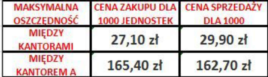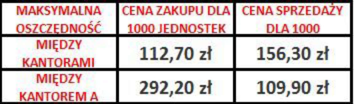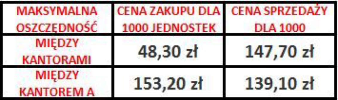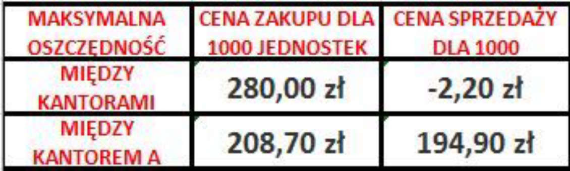 W drugiej wyliczone zostały różnice w cenie kupna/sprzedaży dla najlepszego i najgorszego kursu z kantorów internetowych oraz różnicę w cenie kupna/sprzedaży dla najlepszego kursu z kantoru internetowego i najgorszego kursu z banku. Wszystkie wyliczenia zostały w niej przedstawione dla 1000 jednostek obcej waluty co w przypadku pierwszej tabeli dotyczy franka szwajcarskiego.