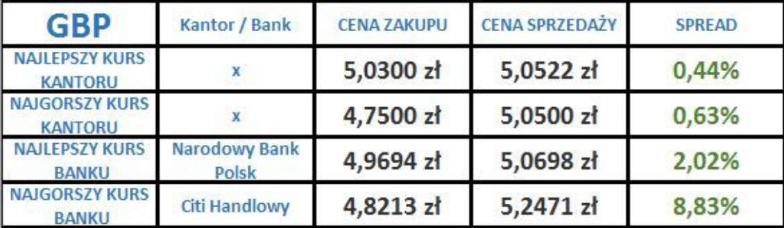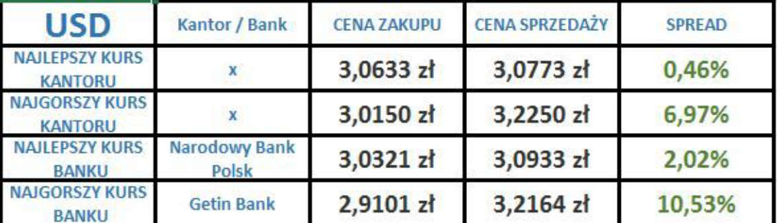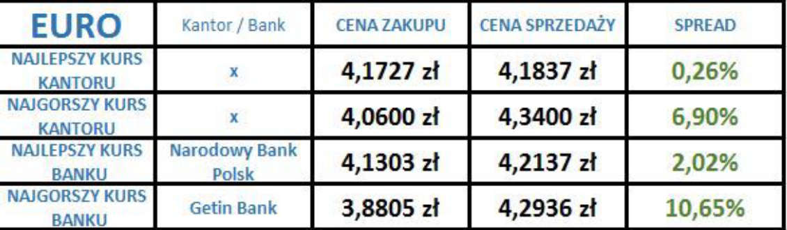 Średnie spready w bankach i kantorach dla poszczególnych walut mają następujące wartości.