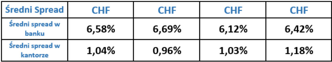Jak wyraźnie widać w przedstawionych tabelach różnica jest znacząca i sięga ponad 10 % spreadu, co przy wymianie franków szwajcarskich w kantorze internetowym z najbardziej opłacalnym kursem w porównaniu do banku o najmniej korzystnym kursie prowadzi do ponad 130 zł. oszczędności.