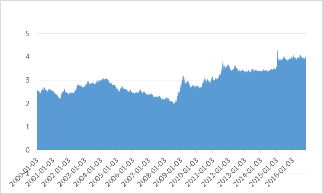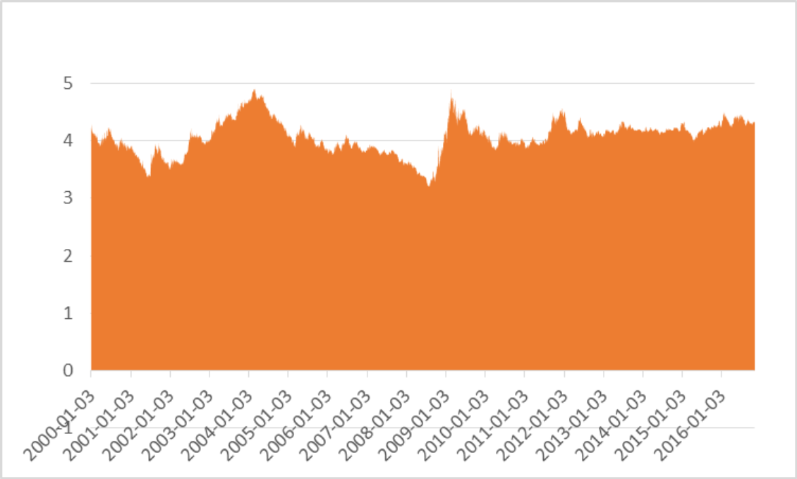 Dla porównania warto na zakończenie spojrzeć na kurs unijnej waluty. Na przestrzeni 16 lat widzimy, że po wejściu do UE, złotówka również sporo zyskała. A po kryzysie podobnie można dostrzec spadek wartości naszej waluty o 1 zł. To także oznacza stratę kredytujących się na podstawie kursu EUR. Niemniej wahnięcie to nie było aż tak brzemienne w skutkach jak dla frankowiczów. Co ciekawe, kurs euro jest teraz identyczny jak na samym początku wieku, co zmusza do refleksji, że jest to długoterminowo, wyjątkowo stabilna waluta.