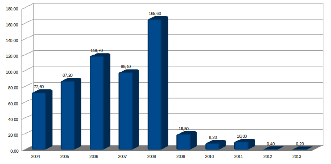 W latach 2005-2012 zapanował więc prawdziwy boom na kredyty w obcej walucie, zwłaszcza frankowe, co widać na poniższym wykresie.