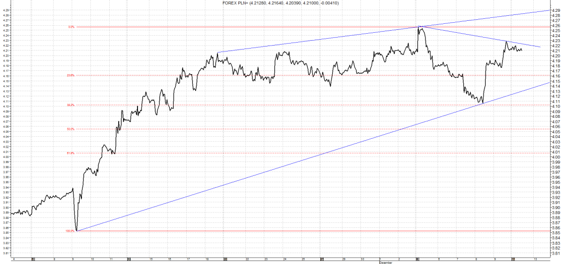 W ostatnich dniach mamy do czynienia ze sporymi ruchami na USD/PLN. Wszystko za sprawą równie dynamicznych zwrotów na głównej parze walutowej świata. Po osiągnięciu maksimum na niemal 4,26 kurs spadł nieco poniżej 4,11. Po posiedzeniu EBC i decyzji o wydłużeniu programu skupu aktywów kurs poszybował znów powyżej 4,20, co było pokłosiem mocnego spadku na EUR/USD. Wydaje się, że to nie koniec tak gwałtownych zmian. W środę mamy posiedzenie Fed i decyzję o stopach. Można powiedzieć, że balon na bardzo jastrzębią retorykę został bardzo nadmuchany a co za tym idzie jest spora szansa, że Fed nie sprosta “zadaniu”. Wtedy EUR/USD powinien ruszyć w górę i odreagować ostatnie spore spadki, USD/PLN wtedy mógłby podążyć z powrotem na 4,10. Tym bardziej, że na EUR/USD zbliżamy się do kilku letnich minimów więc odbicie byłoby czymś naturalnym. Gdy tak się jednak nie stanie a EUR/USD będzie kontynuował ruch na południe to z pewnością USD/PLN przebije opór w postaci górnego ograniczenia kanału wzrostowego i przebije poziom 4,30.