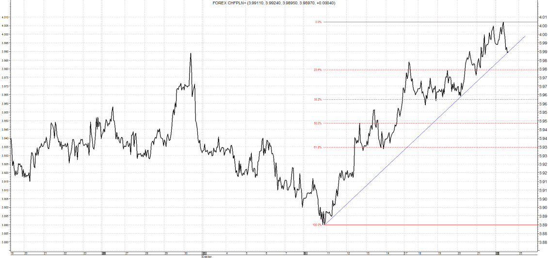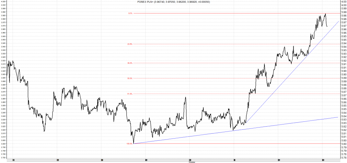Kurs po osiągnięciu minimum na poziomie 3,89 dynamicznie ruszył w górę. Ku niezadowoleniu kredytobiorców frankowych kolejne opory w postaci zniesień Fibonacciego pękały bez przeszkód. W efekcie przebity został poziom 3,99 czyli maksimum z końca września. Kurs na chwile przebił nawet poziom 4,00. Za sprawą mocnego dolara polska waluta traciła do wszystkich walut więc także i do franka szwajcarskiego. Przyczyn tak dynamicznego ruchu upatrywać można także w kwotowaniach EUR/CHF. Frank szwajcarski sporo zyskuje do słabego euro, docierając do poziomu 1,08. Wydaje się jednak, że to szczyt możliwości tego ruchu, ewentualna korekta na tej parze mogła by pozwolić nieco zejść na dół na CHF/PLN. Wsparciem będzie linia trendu wzrostowego.