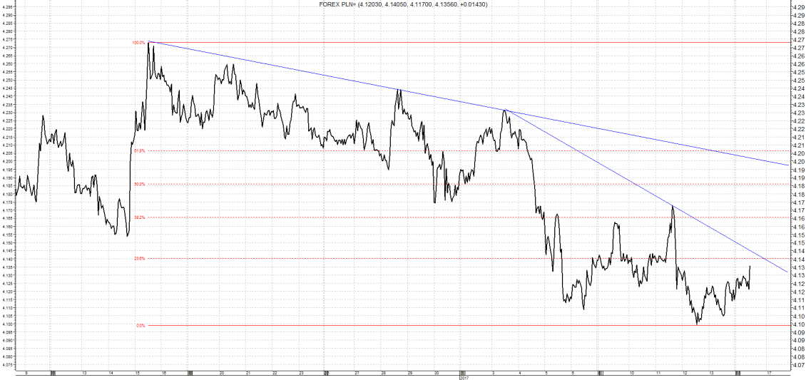 Na USD/PLN mamy również trend spadkowy. Dolar ostatnio jest nieco słabszy na szerokim rynku. W oczekiwaniu na pierwsze wystąpienie Donalda Trumpa nieco zwyżkował. Samo wystąpienie jednak bardzo zawiodło inwestorów w efekcie na EUR/USD dotarliśmy ponad granice 1,0650. Skutkiem tego było zejście na USD/PLN do poziomu 4,10. Dalszy ruch zwyżkowy na EUR/USD nie nastąpił, a nawet dolar nieco odrobił dlatego na USD/PLN również jesteśmy kilka groszy wyżej. W najbliższych dniach możliwy jest jednak wzrost na głównej parze w efekcie słabości europejskiej waluty. Szczególnie jeśli “twardy brexit” zostanie jutro potwierdzony. Ważnym oporem będzie 4,19 czyli górne ograniczenie kanału spadkowego.