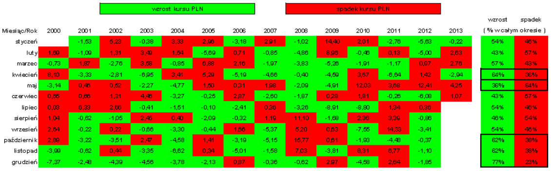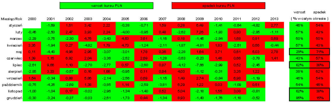 - kurs złotego (w odniesieniu do USD i EUR) niemal zawsze wzrasta w grudniu (co akurat można tłumaczyć, że w grudniu jest zamykana i liczona dziura budżetowa za dany rok)