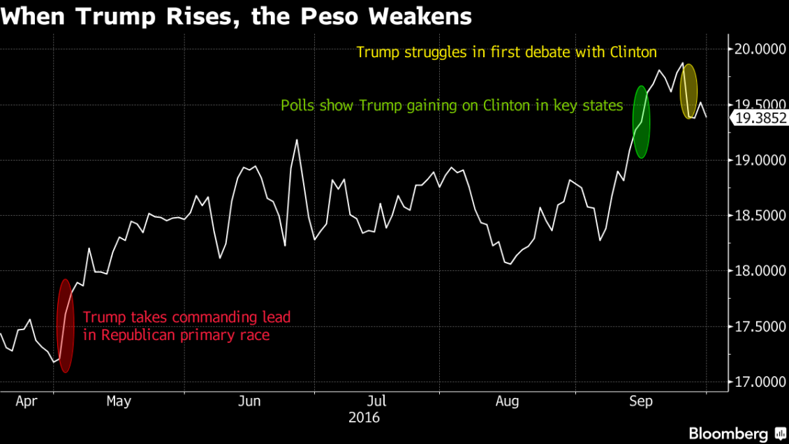 Co ciekawe, Trump wpływał na kursy walut nawet jak jeszcze nie został prezydentem. Jak zauważa Andres Jaime z banku Barclays: od kiedy Trump został oficjalnym kandydatem na prezydenta z ramienia partii Republikańskiej, Meksykańskie Peso sukcesywnie się osłabia - co widać na poniższym wykresie przygotowanym przez Bloomberg.