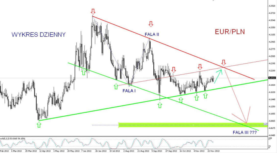Na EUR/PLN podobna sytuacja jak w przypadku dolara. Znajdujemy się w korekcie wzrostowej. Poziom 4,22 powinien zostać osiągnięty niebawem. Z tego też miejsca wg analiz fal powinna się rozpocząć najsilniejsza fala III. Zasięgiem wg ekspansji Fibonacciego do 4,07. Obraz tych par jest dość przejrzysty lecz przyszłości nie sposób przewidzieć w 100%. Trzeba więc być czujnym i gotowym do reakcji w odpowiednim momencie.