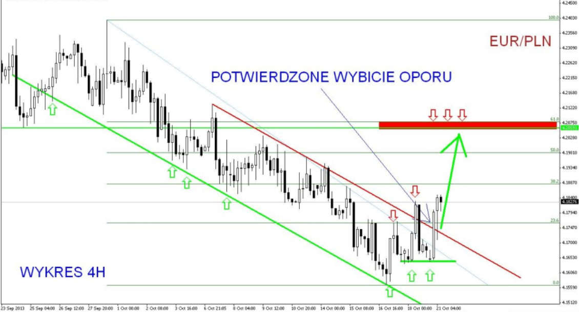 Jak już to było sygnalizowane w poprzednim tygodniu, w przypadku pary walutowej EUR/PLN na wykresie widać kilka następujących po sobie wyższych szczytów. W tym momencie euro podąża w kierunku 4,20. Chociaż w średnim okresie złotówka powinna się umacniać, obecne osłabienie jest potrzebne dla późniejszej korekty i następujących po niej sporych spadkach. Długie białe świece doskonale pokazują jak duża jest presja ze strony popytu.