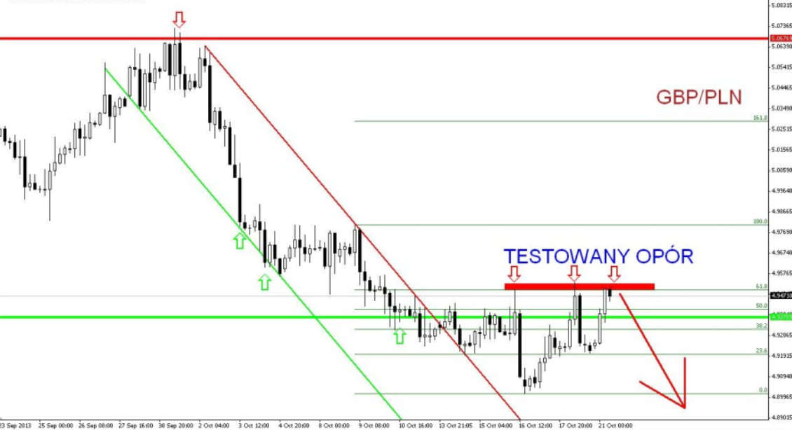 Z kolei, para GBP/PLN wykreowała nową linię oporu w okolicach 4,95. Świadczy o tym fakt, że kurs próbował atakować ten poziom już 3 razy ale za każdym razem jednak kończyło się błyskawicznym spadkiem. Obecnie nadal wykonywane są ruchy w obrębie tego oporu. Jeśli opór wytrzyma, to można się spodziewać, iż funt ustąpi i przebije ostatnie dołki na 4,90. Jest to bardzo prawdopodobny scenariusz.