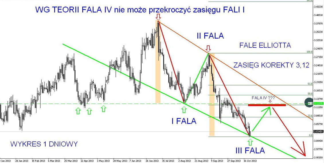 Na poniższym wykresie wyraźnie widać niechybne osłabienie dolara. Kurs dolara powinien teraz zacząć się umacniać w okolice 3,12zł by odbić i zacząć spadać.