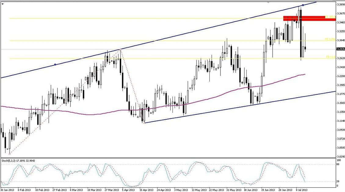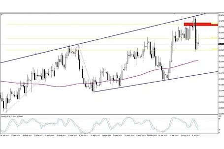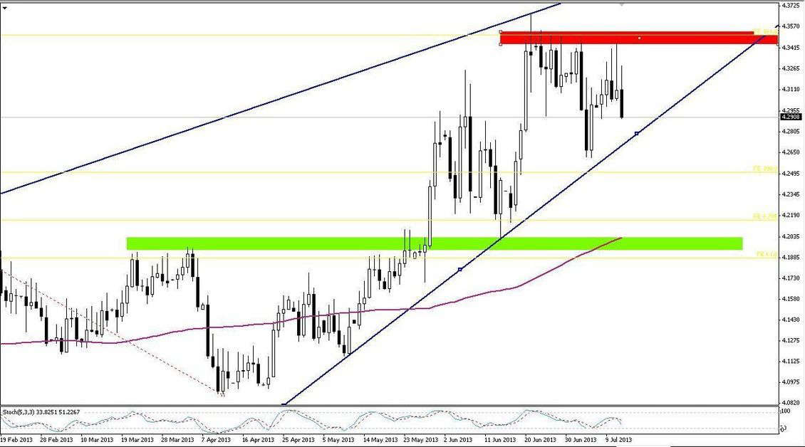 Poziomów 4,30 może w tym tygodniu stać się faktem. Dodatkowo tutaj umiejscowione są szczyty z kwietnia i one też będą chciały pchać rynek w górę. Ta nie wykluczona korekta może być również w późniejszym czasie wykorzystana przez obóz byków, gdyż rynek będzie realizował zyski z pozycji SELL a co za tym idzie nie będzie takiej dużej presji ze strony sprzedających.