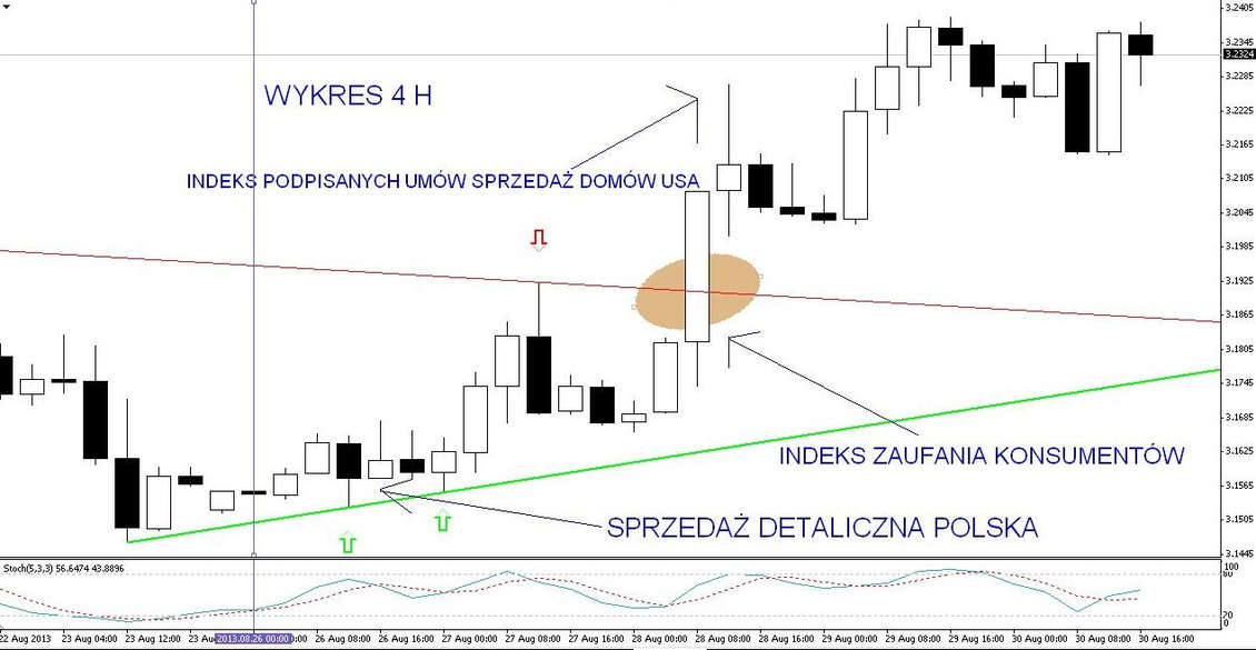 EUR: Poranek tego dnia należał do danych z Niemiec. O godz 8:00 opublikowano dane ze sprzedaży detalicznej w skali m/m, które rozczarowały. Prognoza 0,5% m/m zupełnie odbiegła od faktycznie zaobserwowanej wartości -1,4% m/m. W perspektywie r/r było już znacznie lepiej, ponieważ wynik 2,5% okazał się tylko o 0,3% lepszy od przewidywań analityków. W II kwartale 2013 roku wzrost gospodarczy w Polsce przyspieszył do 0,8% r/r (dane niewyrównane sezonowo). Dla porównania w I kwartale wyniósł on 0,5% r/r, kiedy to znalazł się on na 4 letnim dnie. W strefie euro stopa bezrobocia za miesiąc lipiec wyniosła 12,1%, tyle samo co w zeszłym miesiącu. Z kolei, koniunktura gospodarcza za miesiąc sierpień okazała się lepsza niż oczekiwano ale nadal na minusie.
