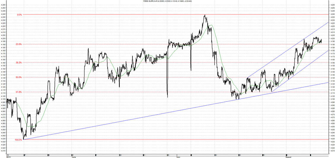 Wielu analityków zastanawia się co dalej. Pytanie to jest o tyle istotne, że jak widać Pekin jest zdeterminowany bronić wzrostu gospodarczego, by nie pokazać gorszych danych niż 7% wzrostu. Na szczęście działania te nie mają jeszcze bezpośredniego przełożenia na złotówkę. Niemniej spadające ceny ropy i innych surowców powinny przedłużyć okres niskich stóp procentowych na świecie. Ryzyko wzrostu inflacji przy ropie poniżej 50 dolarów za baryłkę jest znacznie mniejsze. Problemy Chin mogą również skłonić FED do nie podejmowania decyzji już na wrześniowym posiedzeniu w obawie przed eskalacją problemów. W takim scenariuszu doszłoby do osłabienia dolara, który rósł w siłę w nadziei na wrześniową podwyżkę.