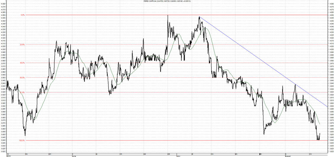 Kurs CHF/PLN utworzył trend wzrostowy, z którego doszło do wybicia w dół. Ku uciesze kredytobiorców można dalej mówić o dłuższym trendzie spadkowym. Po przebiciu ważnych minimów na 3,9000, kolejnym ważnym poziomem jest 3.8450.