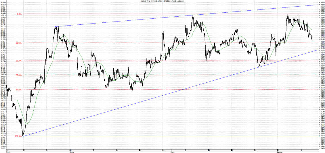 Kurs USD/PLN porusza się w ramach szerokiej formacji wzrostowej. Opór stanowić będzie maksimum na poziomie 3,8500. Kolejnym wsparciem są minima na 3,7600.