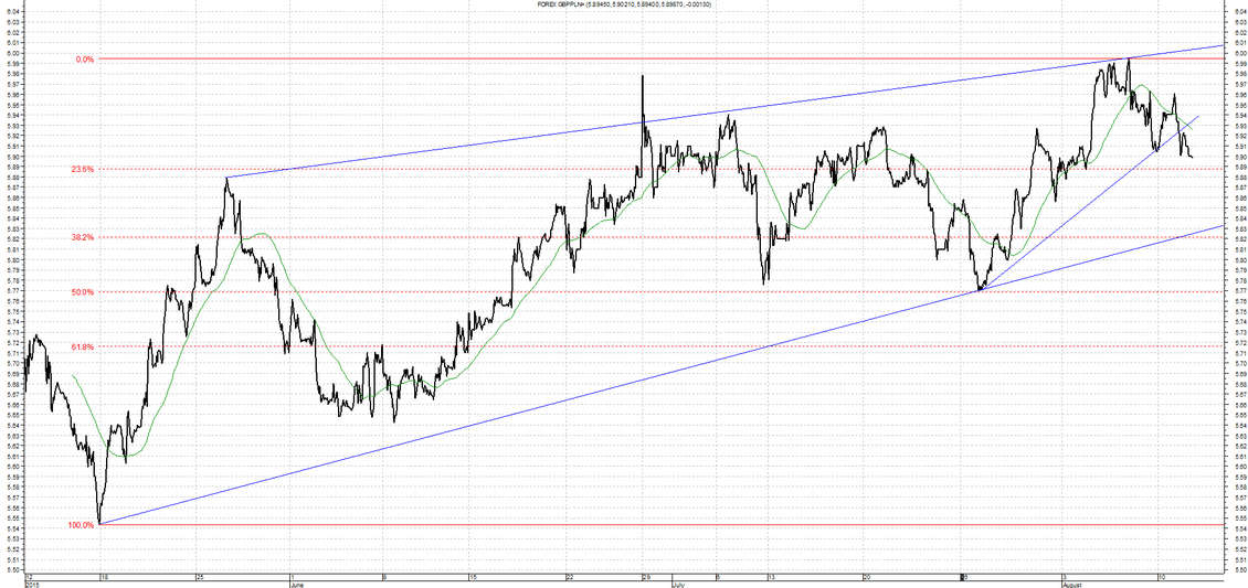 Kurs GBP/PLN podobnie jak USD/PLN porusza się w ramach szerszej formacji wzrostowej. Oporem dla ewentualnych wzrostów jest ostatnie maksimum na 5,9900. W przypadków spadków najbliższym wsparciem jest Ostatnie minimum lokalne na 5,7700.