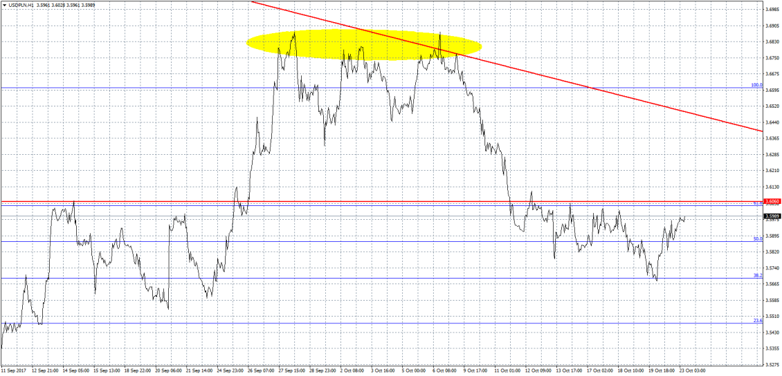 Na przełomie września i października na wykresie USDPLN obserwowaliśmy tworzenie się formacji potrójnego szczytu. Warto zauważyć, że ostatni wierzchołek naruszył na chwilę długoterminową linię trendu spadkowego. Ma ona swój zalążek jeszcze w grudniu poprzedniego roku i od tego czasu była testowana kilkukrotnie. Za każdym razem próba jej wyłamania kończyła się nie tylko niepowodzeniem, ale prowadziła również do intensywniejszych spadków. Podobnie jest obecnie, gdzie dolar na skutek nieudanego ataku potaniał o blisko 10 groszy. Obecnie znajduje się w okolicach 3,60 i walczy z oporem, który ukształtował się niecałe dwa tygodnie temu. Wiele wskazuje na to, że i tym razem ta walka zakończy się niepowodzeniem. Dolar znajduje się o 10 groszy od tegorocznego minimum i niewykluczone, że w najbliższym czasie spróbuje je naruszyć.
